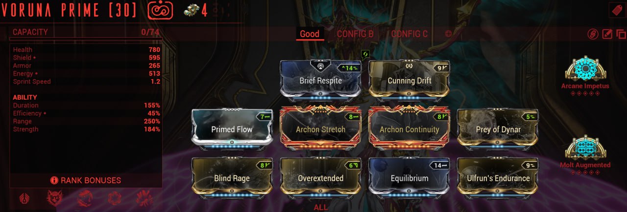 - Main mods: Primed Flow, Archon Stretch, Archon Continuity, Prey of Dynar, Blind Rage, Overextended, Equilibrium, Ulfrun’s Endurance